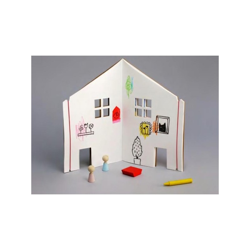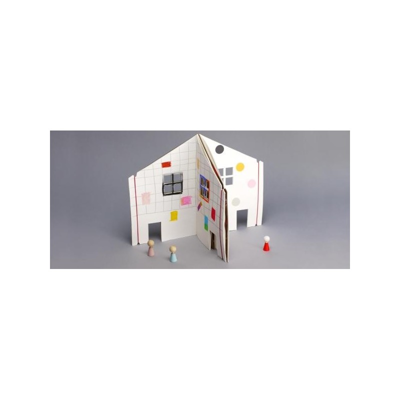 Creative game consisting of a 30-page house-shaped notebook and a series of 5 small wooden figurines to dress up that can inhabit the spaces drawn on the white pages of the notebook