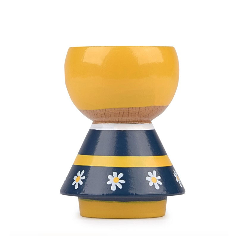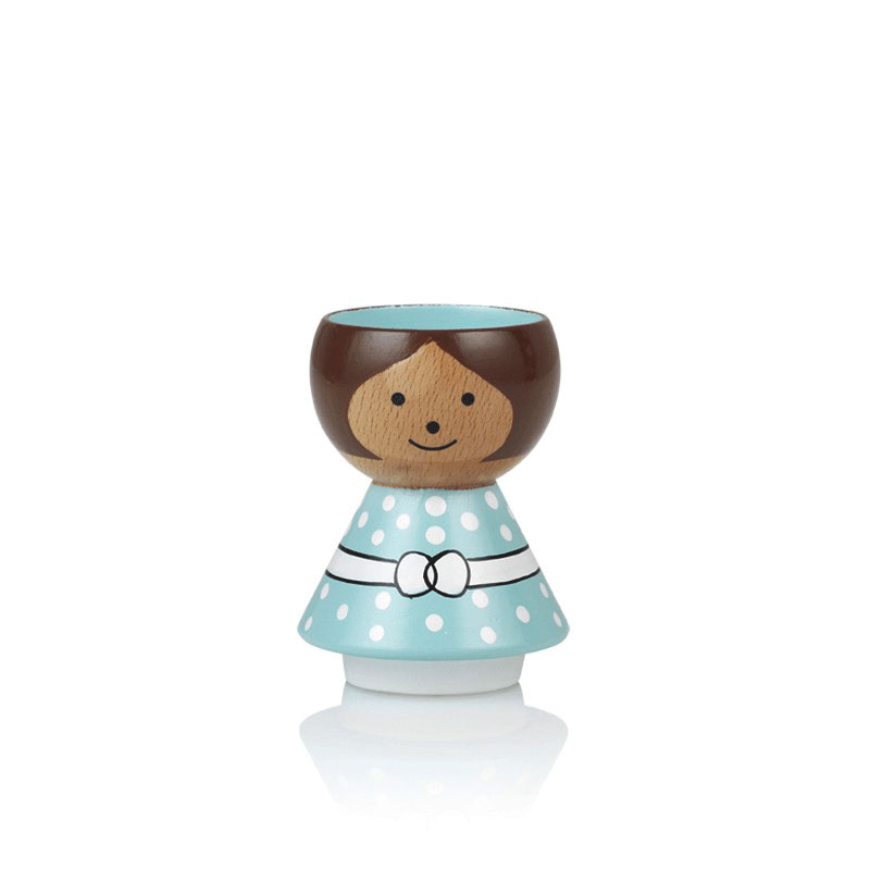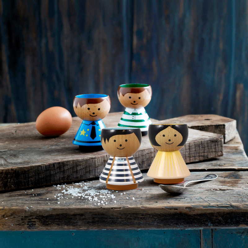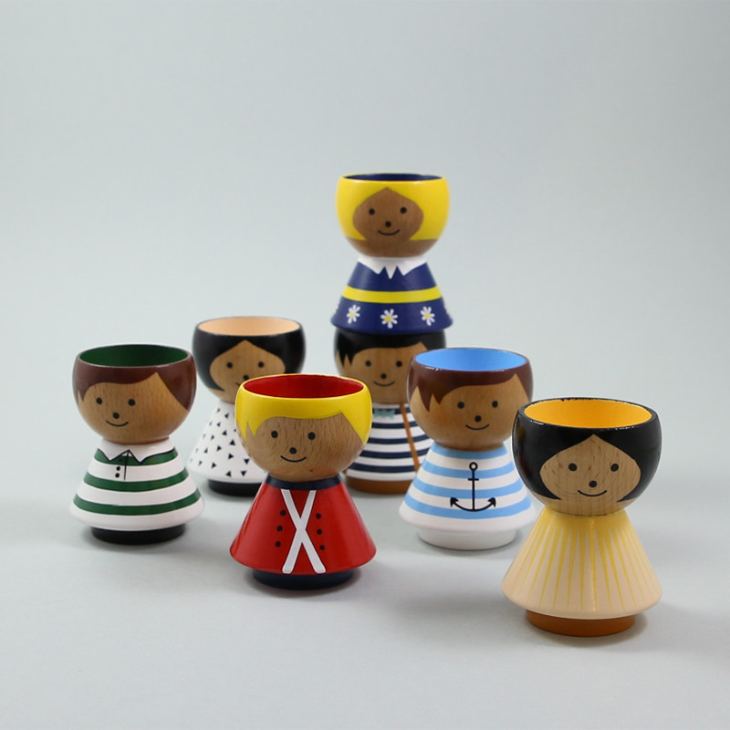 Traditional and somewhat folkloric spirit of wooden egg cups and, at the same time attention to detail and very contemporary colors, these little characters will brighten up your table and your shelves.