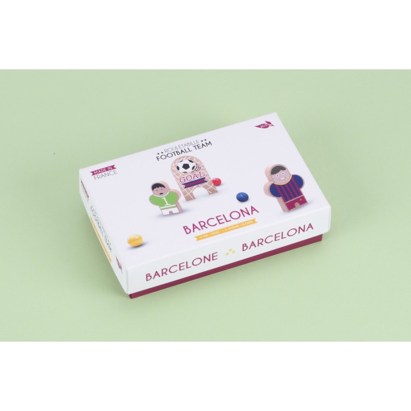 This foot game is made up of 2 wooden players, 1 wooden goal, 3 balls in the team colors and 3 personalization stickers to stick yourself.