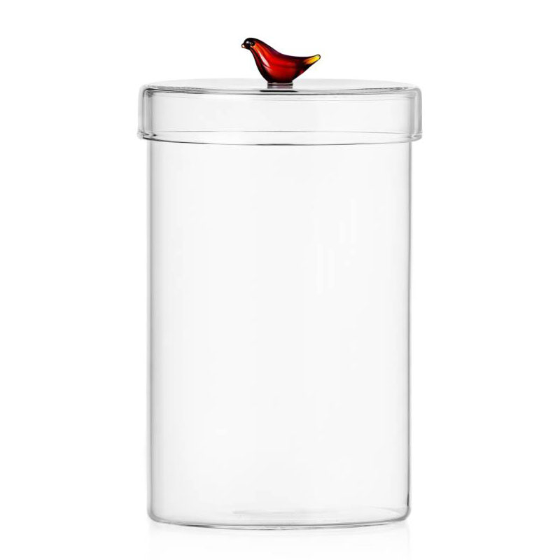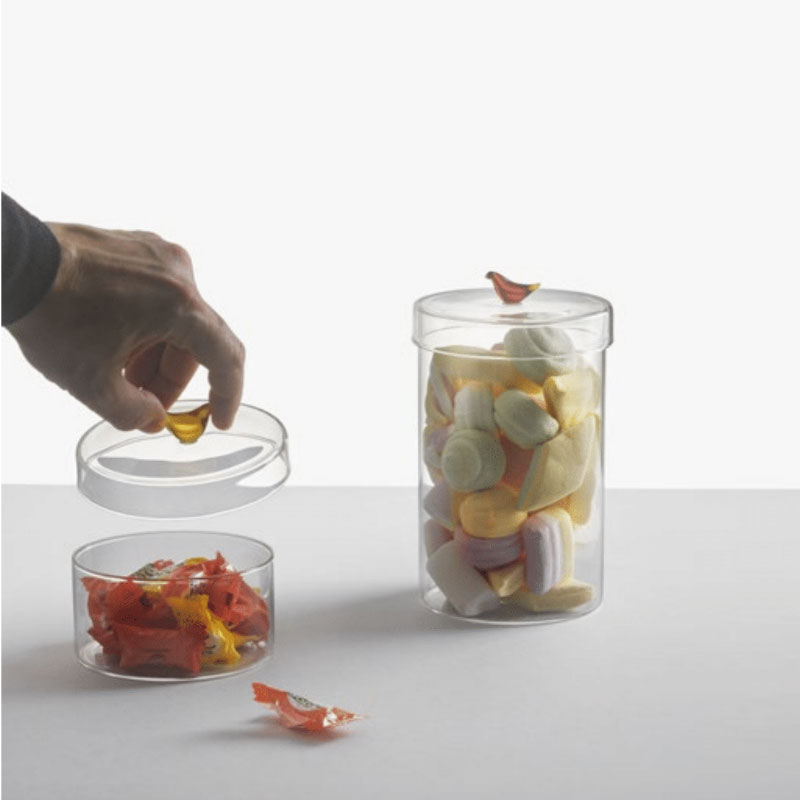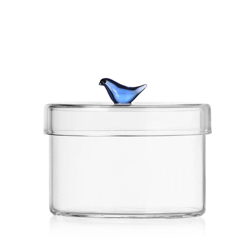 Perfect in the kitchen for storing spices and sweets; or as a storage compartment to store your jewellery, for example, these transparent glass boxes are nicely equipped with a lid decorated with a small bird in colored glass.