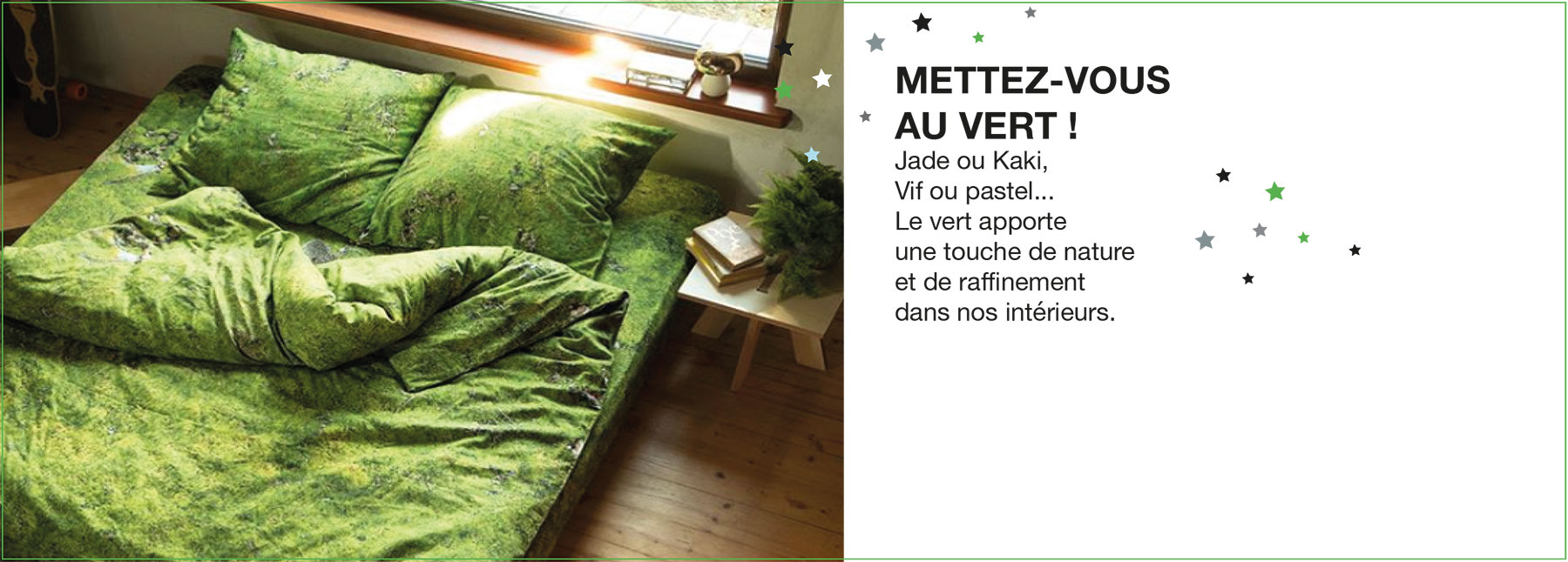 Couleur de l'espoir, couleur de l'amour, le vert est surtout associé à la nature dont il peut faire entrer les bienfaits par touche lorsqu'il est utilisé dans nos intérieurs. Associé à des tonalités clairs, il offre une vraie respiration et peut dégager une certaine énergie. En complément de teintes plus sombres, il pportera un raffinement et une élégance qui lui sont propres...