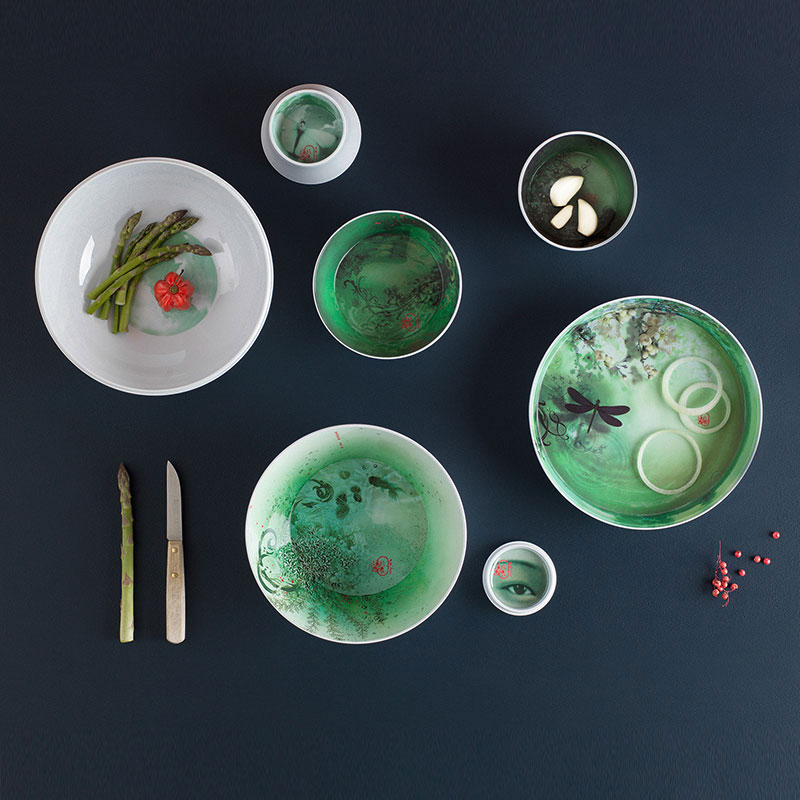 Sa plus grande force est la référence à la nature. De manière réaliste ou symbolique, l'usage du vert fait entrer un peu de fraîcheur et de naturel dans la déco ; à l'instar de la patère Latva dont la forme fait référence à un bouquet de branchage et dont la version verte apporte une bouffée de chlorophylle pure sur le mur... Avec une dimension plus poétique, le set de contenants Ming Acqua du collectif Ibride apporte quant à lui un souffle de nature aux arts de la table.