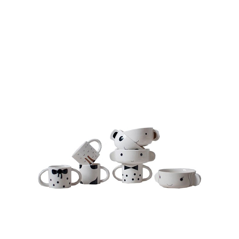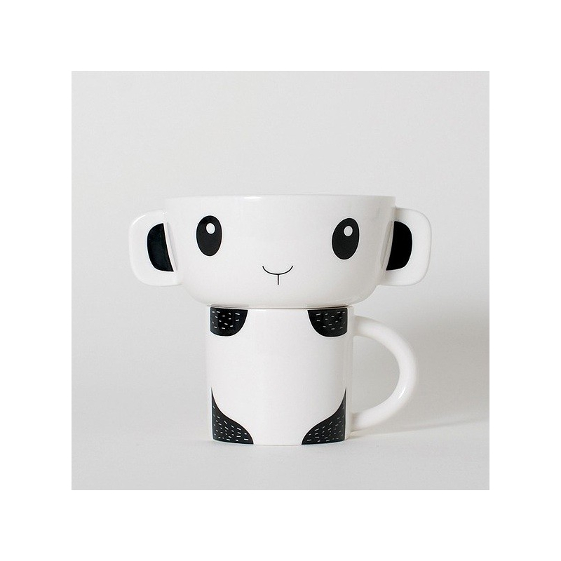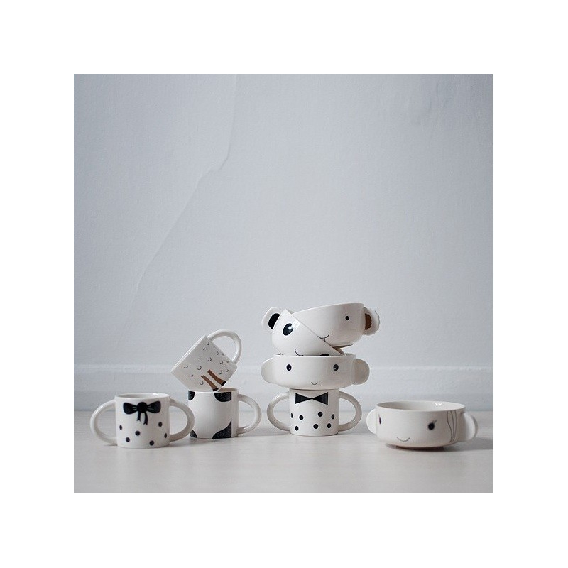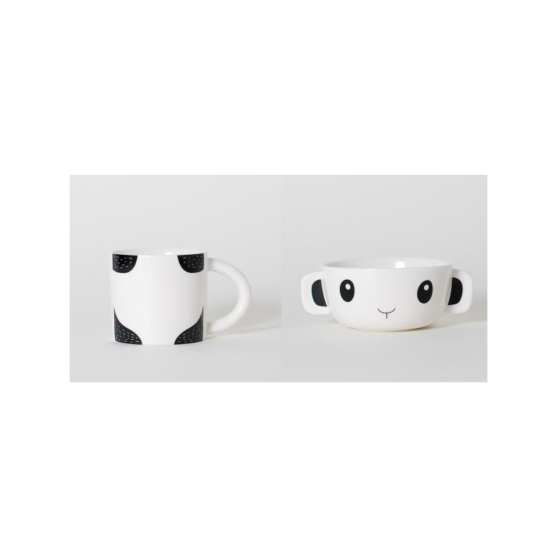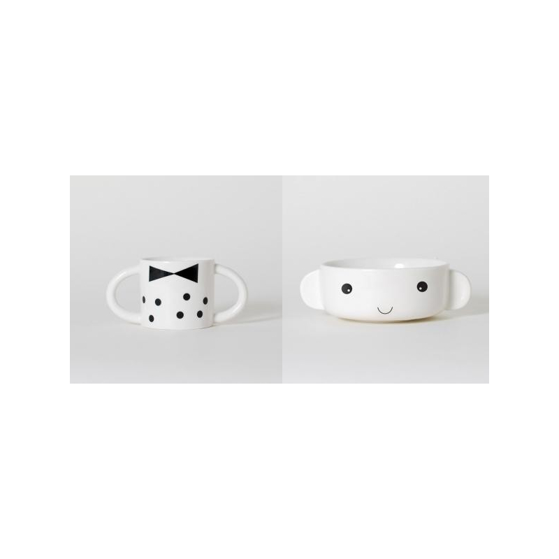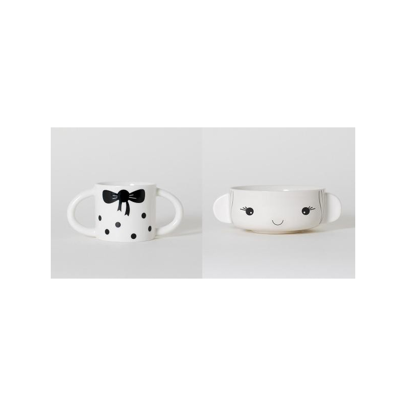 Se compose d'un bol et d'une coupe en porcelaine blanche avec des motifs noirs et qui se superposent