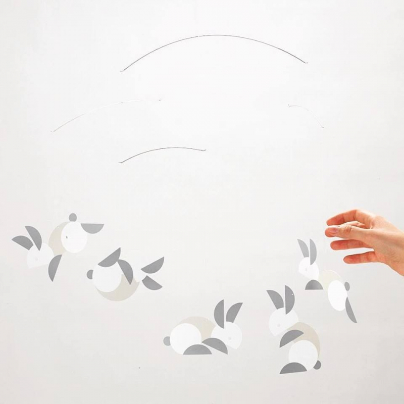 Idéal pour les tout petits qui, jusqu'à un an, ne perçoivent que le noir et le blanc, ce mobile associe la douceur de tons pastels à la joie qui se dégage dans cette scène de petits lapins en train de jouer...