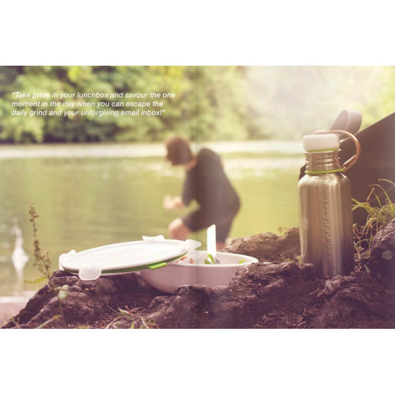 Cette bouteille isotherme de la marque anglaise Black and Blum a été conçue pour être très fonctionnelle : pas de bouchon à visser mais un bouton pression qui libère en un geste et d'une seule main le liquide.