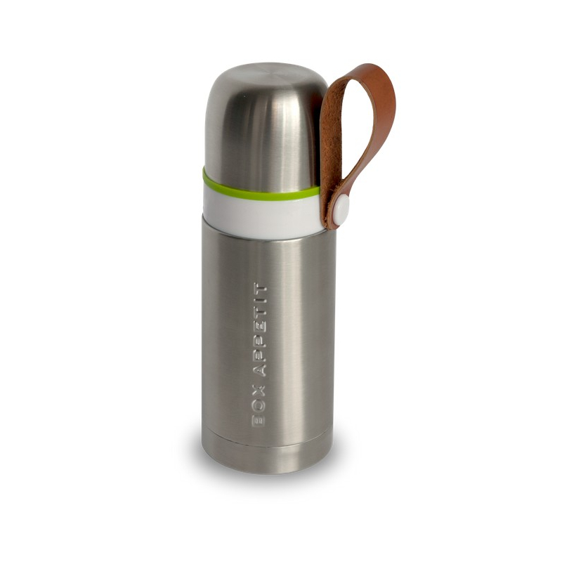 Cette bouteille isotherme au design un peu rétro est la fois esthétique et pratique avec sa sangle et son bouton poussoir qui permet en un geste de se verser sa boisson restée chaude (pendant 8h) ou froide (pendant 24h).