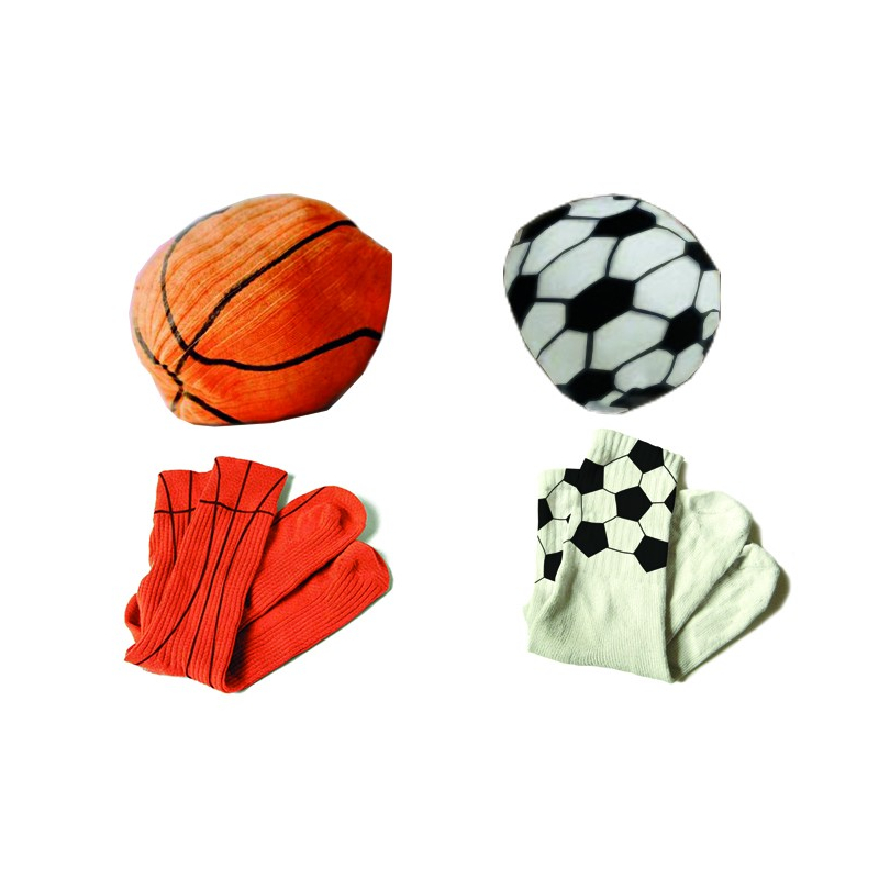 Lot de deux paires de chaussettes en coton qui, une fois en boule, ont la forme d'un ballon de foot pour l'une, et d'un ballon de basket pour l'autre.