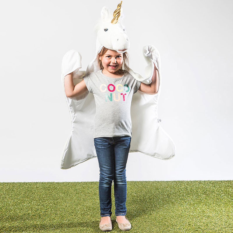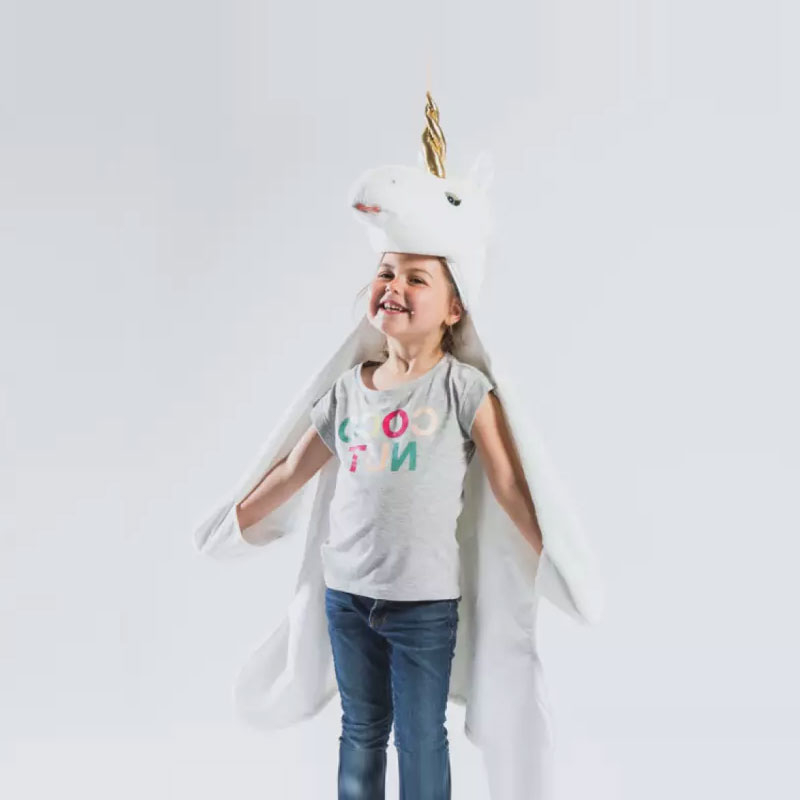 - se déguiser en licorne en enfilant la capuche tête de licorne et en mettant ses mains dans les pattes