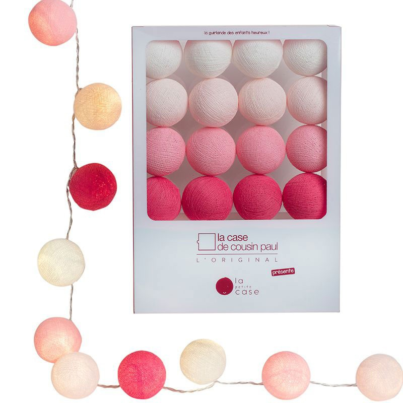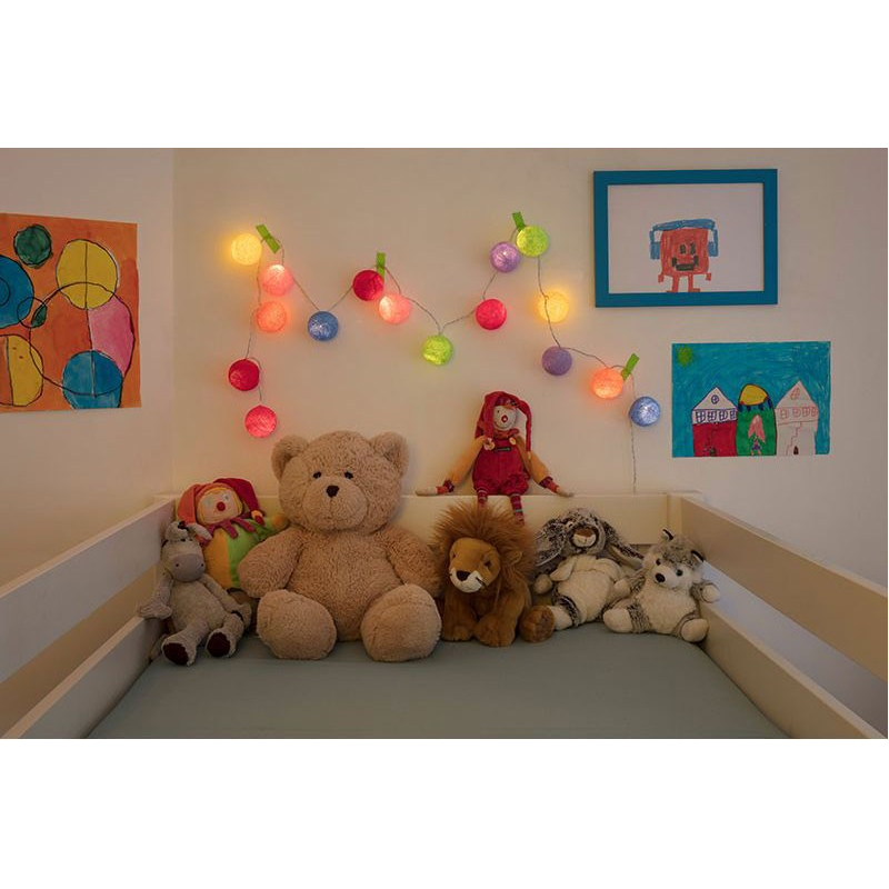 Cette guirlande lumineuse pour les petits "La Petite Case" de la marque française La Case de Cousin Paul est constituée de 16 boules en fil de polyester de 5,5 cm de diamètre prédécoupées pour un assemblage plus facile. Elle fonctionne avec un interrupteur :