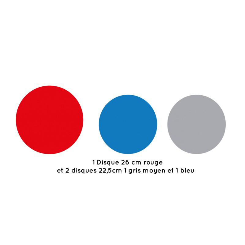 - 1 disque de 26cm rouge + 2 disques de 22,5cm : 1 gris moyen et un bleu