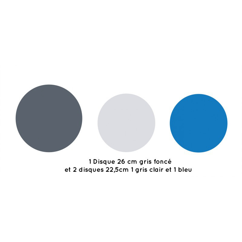 - 1 disque de 26cm gris foncé + 2 disques de 22,5cm : 1 gris clair et un bleu