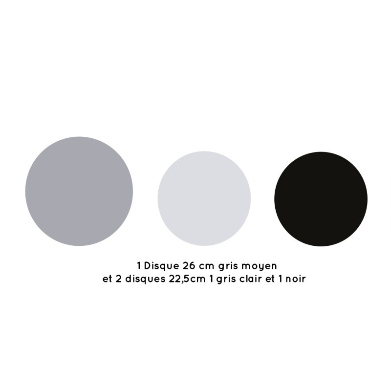 - 1 disque de 26cm gris moyen + 2 disques de 22,5cm : 1 gris clair et un noir