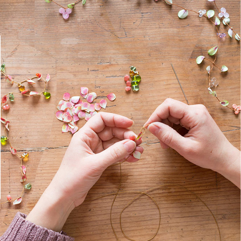 Il est composé d’une quinzaine de petites gouttes de verre filé au chalumeau de différentes couleurs douces, rose, vert, bleu, orange ainsi que d’une trentaine de petits pétales de coton. Chaque pétales est teinté, découpé puis peint à la main. Le tout est monté sur un fil de polyester enduit.