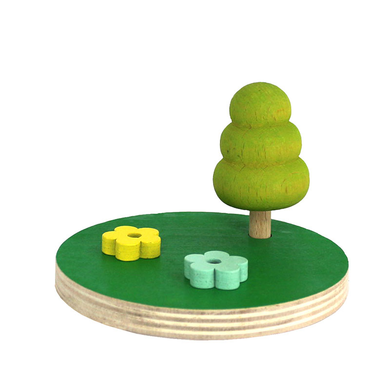 Jeu en bois constitué d'un plateau magnétique, d'une craie de petits personnages et d'éléments de décor en bois peint (19 en tout)