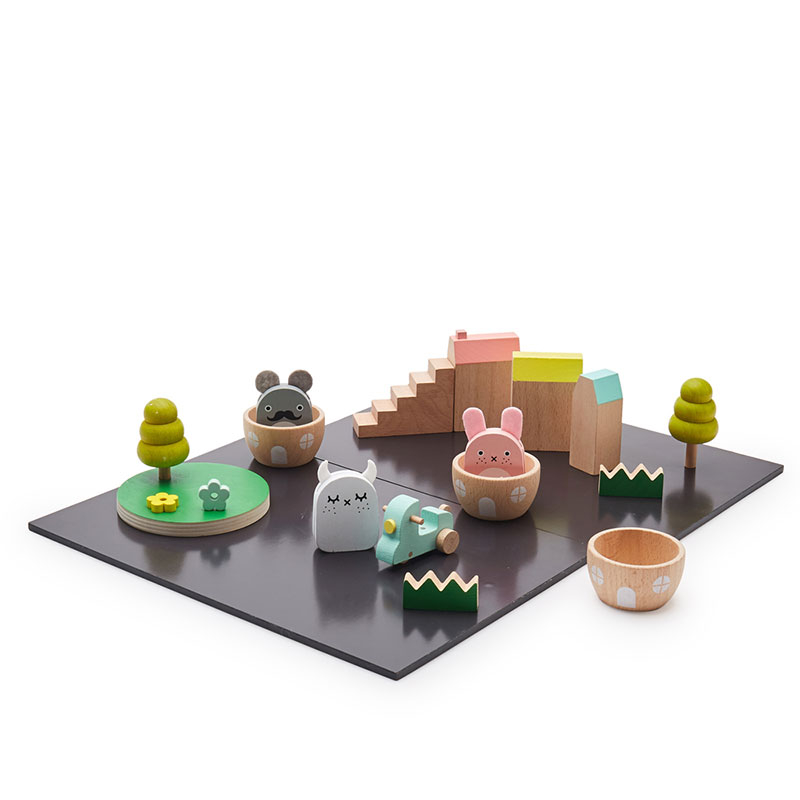 Composé d'un plateau magnétique sur lequel les enfants pourront positionner des arbres et des maisons multicolores, ce jeu imaginatif et ludique sera le point de départ de bien des histoires. Les protagonistes sont les petits personnages, les Ricemonsters : une souris, un lapin et un hibou (?) qui ont chacun un bol de riz pour passer la nuit... Et, pour se rendre visite les uns les autres : un scooter ; que demander de mieux ?