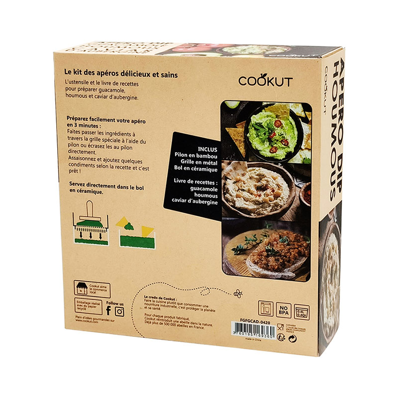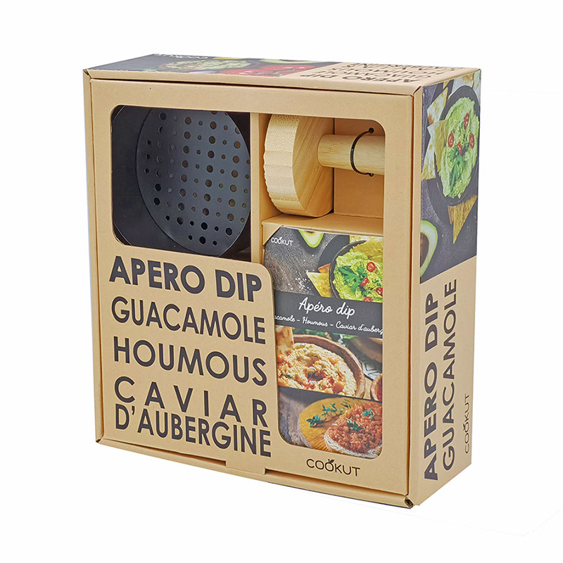 Set de cuisine pour préparer guacamole, houmous, caviar d'aubergine constitué d'un bol en céramique, d'une grille en métal, d'un pilon en bois et d'un livre de recettes.
