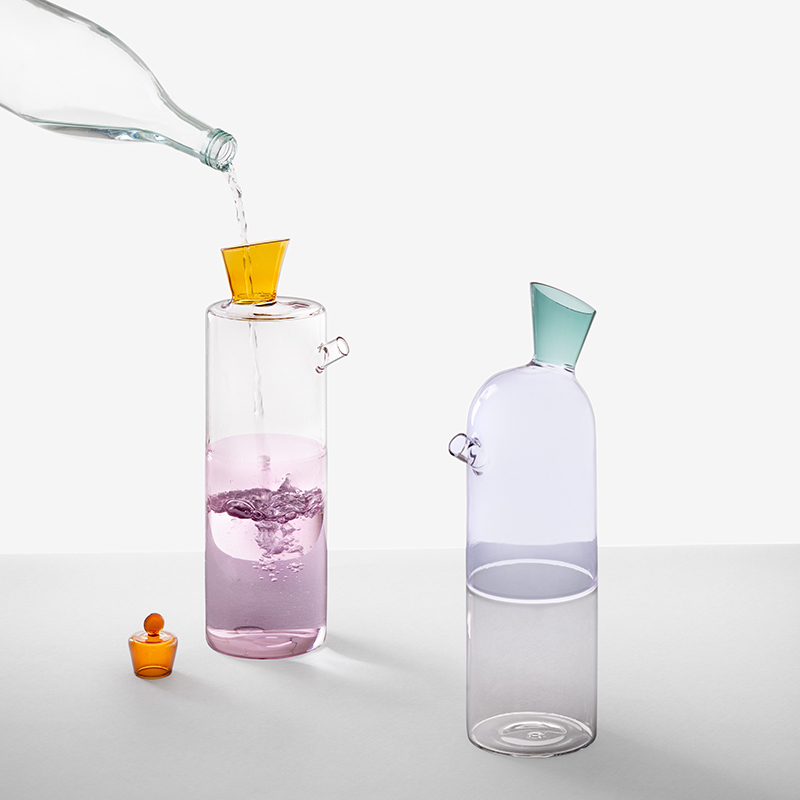 En plus de ce jeu sur les couleurs, elle amplifie les formes et les fonctions : son goulot s'élargit comme un entonnoir et facilite son remplissage ; alors que le verseur lui, se fait petite excroissance délicate... un très bel objet pour la table !