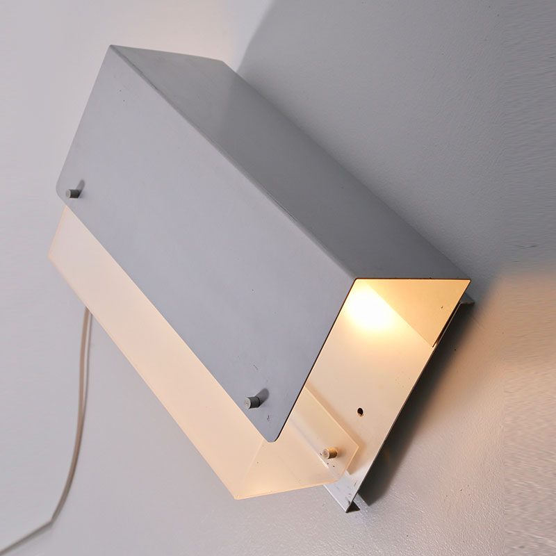 Applique originale aux lignes épurées et aux matériaux d'époque très contemporain : l'aluminium et le plexiglas.