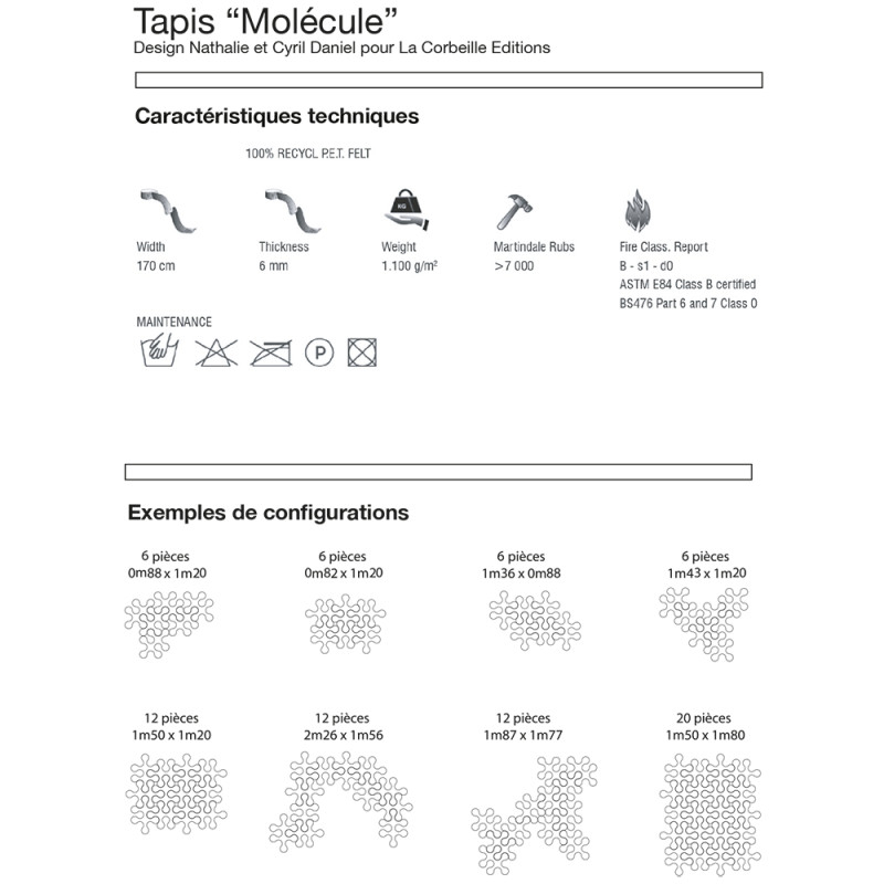 Chaque pièce mesure 57,5 x 42 x 0,5 cm. Tous les éléments peuvent s'emboiter ensemble de multiples façons afin de composer le tapis qui conviendra le mieux à votre espace.