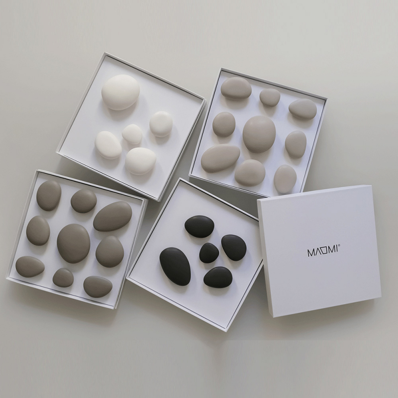 Chacune des 9 pièces a une forme et une taille différente ; 5 sont de couleur noir mat et 4 sont gris mat. Complètement modulable, vous pourrez disposer chaque élément librement sur votre mur pour composer un décor aussi pratique qu'esthétique.