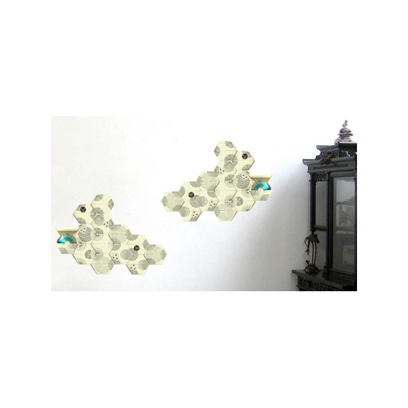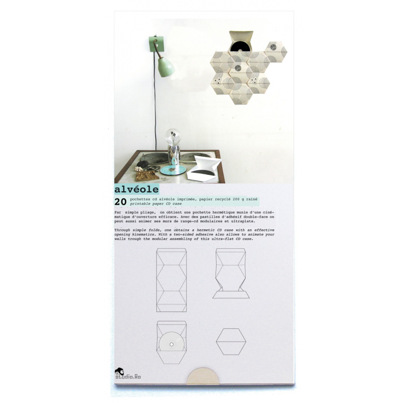 Des pochettes CD en papier imprimé d'un joli motif que l'on peut accrocher au mur pour créer un décor graphique et esthétique : ce sont les Alvéoles du duo de designers Studio Lo.