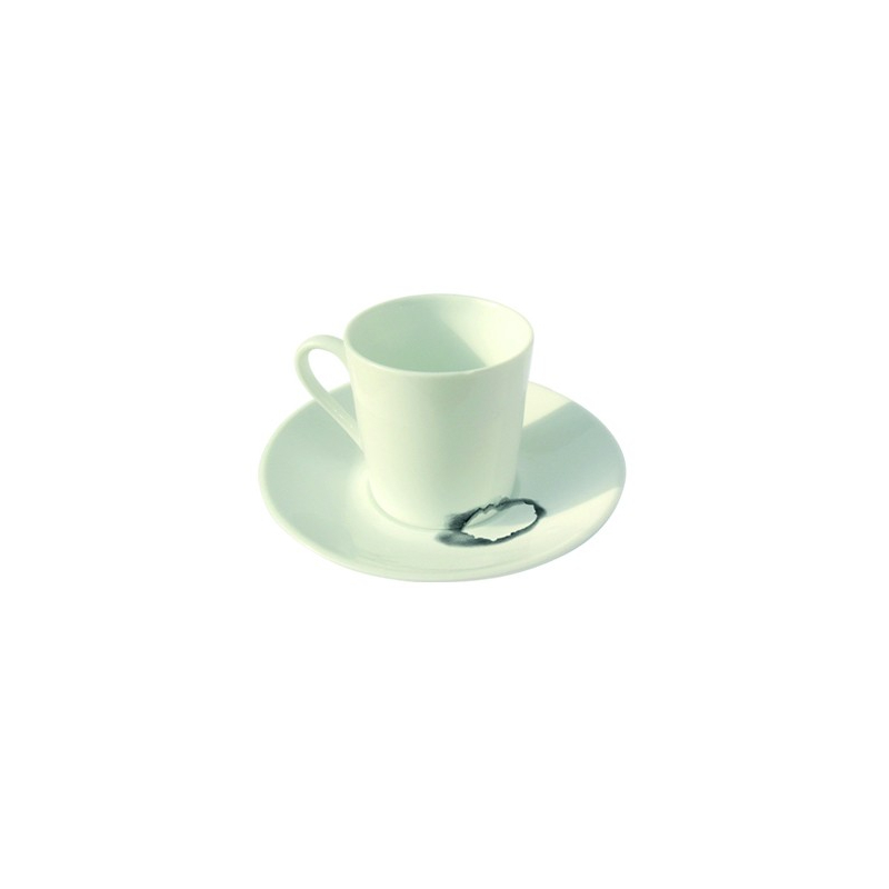 Classique dans le noir et blanc de ses couleurs, élégante dans la finesse de sa porcelaine, cette ensemble tasse et sous-tasse créera la surprise en donnant l'illusion d'une trace de brûlure...